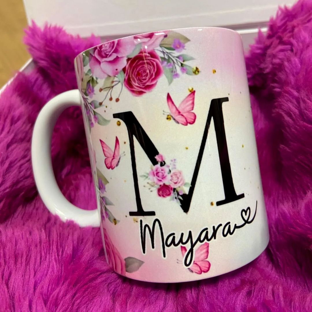 Fundo florido em tom rosa com Letra Inicial e nome personalizado abaixo.